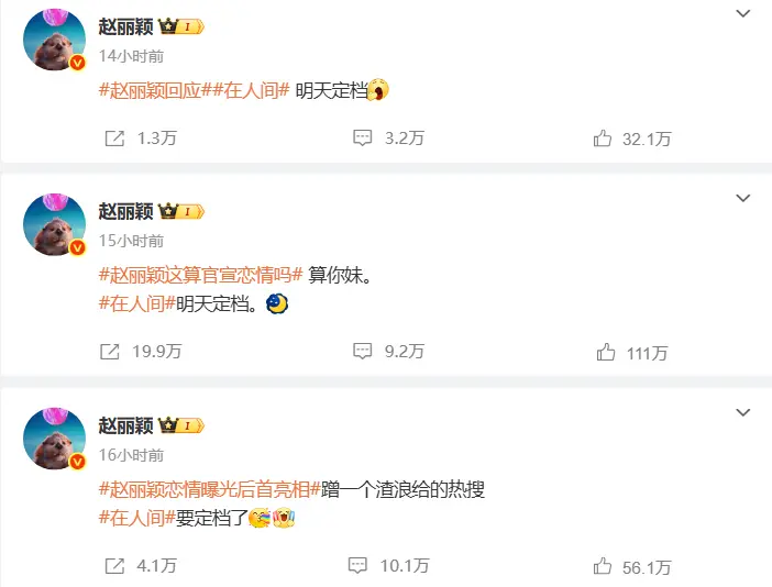 脚下,赵丽颖连发三条微博申报恋情,“赵小刀” 重出江湖硬刚热搜,径直爆粗口,反手又预报了一波新剧。