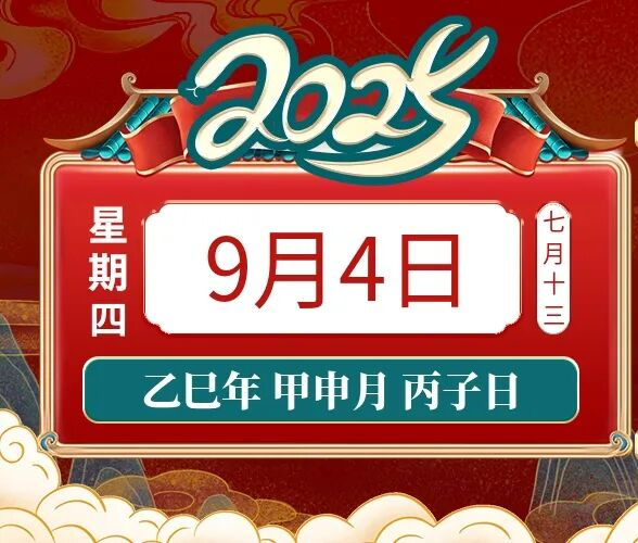 2025年9月4日,星期四,农历七月十三 (乙巳年甲申月丙子日),法定职责日。