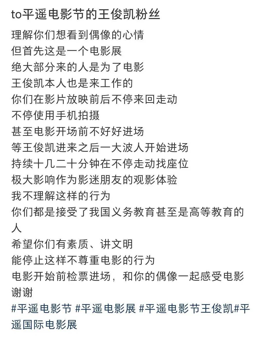 近日,王俊凯现身平遥电影展,有东说念主在不雅影现场握住对王俊凯进行拍照相响到其他不雅影东说念主员,激励热议。
