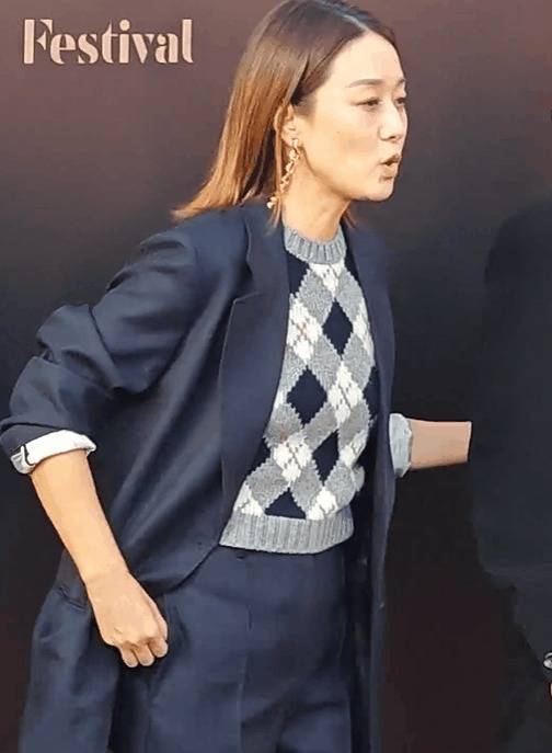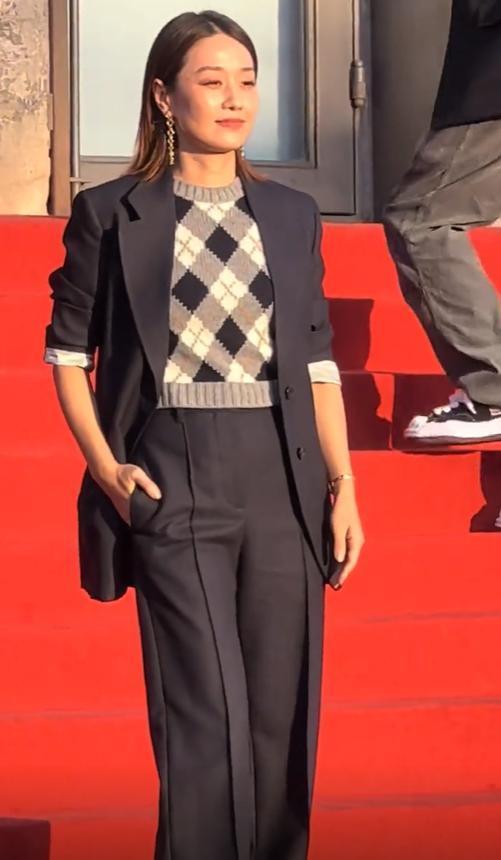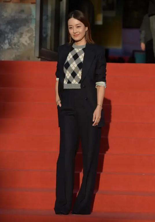本届电影展的红毯上,马伊琍身穿西服套装内搭格纹毛衣。