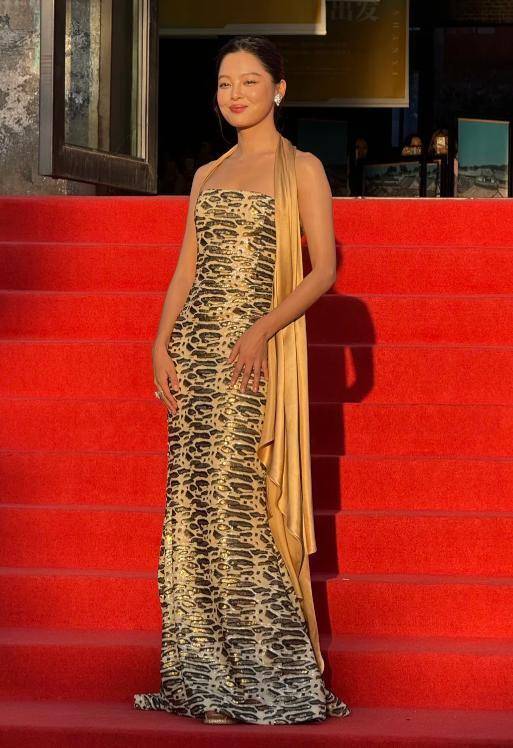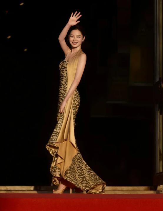 红毯上摇曳生姿,容光昌盛又灿烂、娇艳的样貌当的确亮眼。
