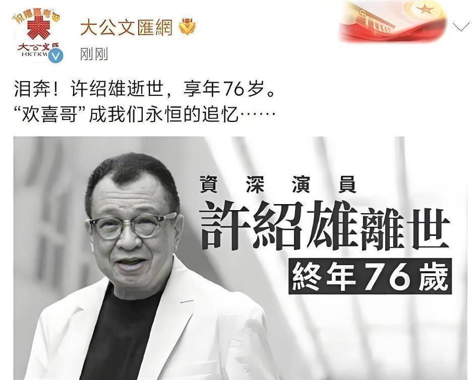 10月28日凌晨2时30分,香港资深演员许绍雄因癌症激励多重器官功能短少安适离世,享年76岁。