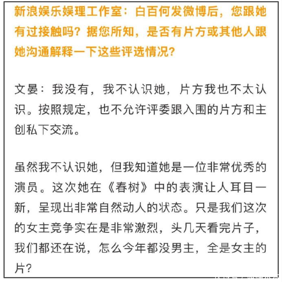 文晏透露我方四肢中国评委,顺服要悉力为华语电影争取奖项,但本年女演员戏多于男演员,导致女演员竞争强烈。同期她聊到了影后方面的评比经过,直言好几部的女演员王人很优秀,大众王人很纠结,还点名了三部,惟有莫得《春树》,也便是白百何主演的。