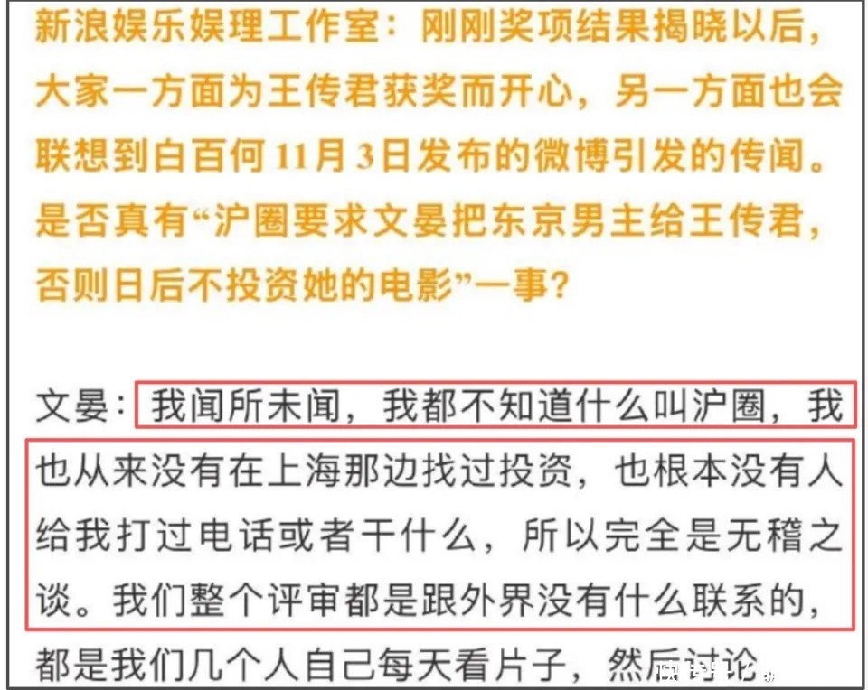 针对白百何发布的微博激发的质疑,文晏透露我方比比皆是:“我王人不知说念什么叫沪圈,我也从来莫得在上海那处找过投资,也根底莫得东说念主给我打过电话或者干什么,是以全王人是天方夜谭。咱们所有这个词这个词评审王人是跟外界莫得什么辩论的,王人是咱们几个东说念主我方每天看片子,然后议论。”