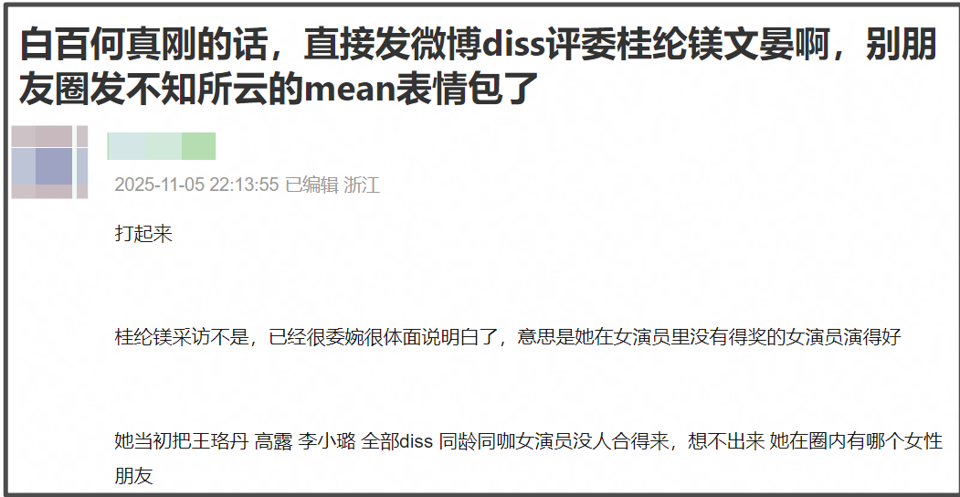 女主角白百何发了一些不足为法的翰墨,莫得明确讲明不悦的是片方一经评委,然而她的批驳区却挂着一则对于沪圈争奖给王传君的爆料,导致大众将锋芒瞄准了评委文晏和王传君。
