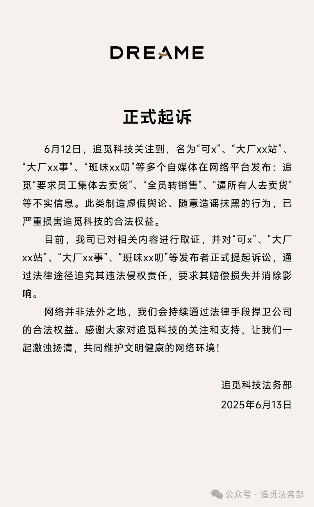 同期,针对近日多个自媒体在集结平台发布“条件职工集体去卖货”、“全员转销售”、“逼整个东谈主去卖货”等装假信息,追觅科技已对关系本色进行取证,并对关系发布者负责拿告状讼,通过法律阶梯讲究其行恶侵权拖累,条件其抵偿亏欠并列除影响 。